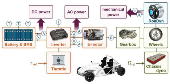 Figure 19, and used to validate the simulation model. The DC side of the three-phase inverter is connected to the battery, and the AC side is connected to the three-phase induction motor. DC and AC voltages and currents are measured using transducers. The Kistler RoaDyn wheel force transducer measures the 6-DOF forces and the wheel’s speed and torque. The throttle device is connected to the inverter to adjust the throttle input. The electrical current and voltage are measured on the inverter’s DC as well as AC sides using the three voltage probes (Tektronix P5200A) and the three zero-flux current transducers (LEM IN 1000-S) [