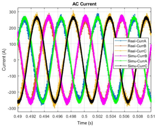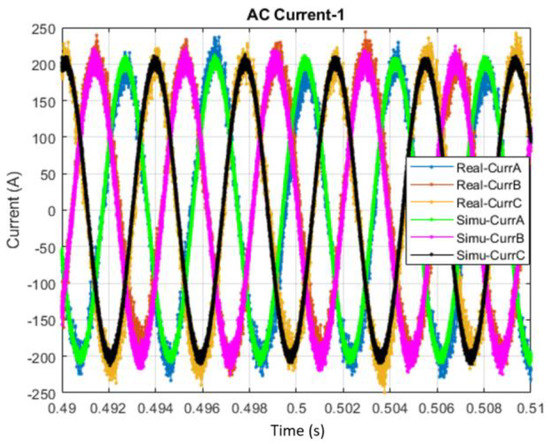 Table 2. In this section, a comparison takes place between the simulation results and the existing inverter data of the Simrod EV. Real high-frequency data are logged by considering three different cases for this comparison. In case-1, the reference speed was set at 2760 RPM, and the motor tracked the command with measured torque of 105 Nm. In case 2, the reference speed was set at 5382 RPM, and the torque became 24.6 Nm, and in case 3, the reference speed was set at 7700 RPM, and the torque was 14.5 Nm. Thus, the simulation results of the three-phase currents are perfectly matched with existing inverter data. Comparison plots are shown in