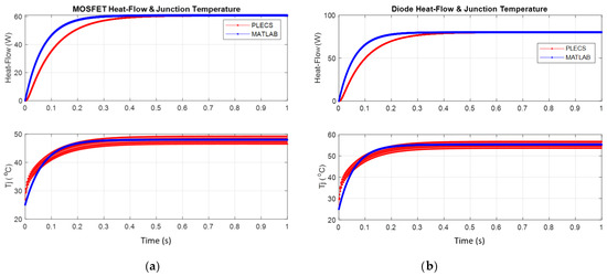 37]. However, in PLECS software, the electro-thermal model is created with the library of the manufacturer’s device, which has conduction, switching, and thermal characteristics. It has been observed that the response of the junction temperature and heat flow coming from developed MATLAB simulation is similar. PLECS versus MATLAB comparison results have been presented in