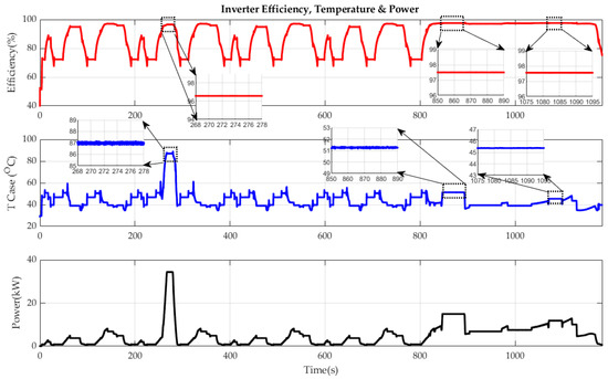 Figure 24. The efficiency (%), case temperature (°C), and power flow (kW) of three cases of the inverter are investigated using a simulation model, as shown in