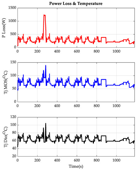 Figure 16. These junction temperatures are used for power loss calculation for the next iteration. The power loss (W) in power electronic modules of the inverter and junction temperature (°C) of the MOSFET and the diode of each leg for the entire NEDC speed have been depicted in
