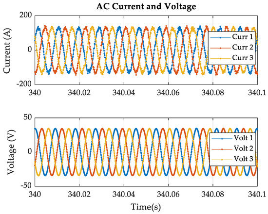 The data acquisition has been made with the Siemens (SCADAS) mobile system at a different sample rate that depends on the bandwidth of examined quantities. Particularly for phase voltages, high-frequency measurement was needed. The square wave character of the PWM AC voltage refers to the presence of an inverter’s 10 kHz switching frequency. Therefore, the electrical quantities such as voltages and currents are logged at a sample rate of 204.8 kHz. In addition to the 92 kHz cut-off frequency built-in anti-aliasing filter, an additional low pass filter (zero phase) of 5 kHz cut-off frequency has been fitted. These filters wash out switching harmonics from high-frequency Yokogawa measurements.