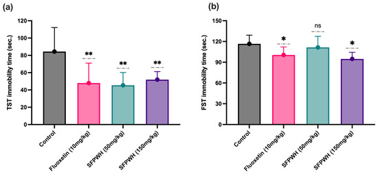 Effect of safflower hot water extract on immobility time in TST. (a) Effect on overall immobility time in TST-induced stress in mice. (b). Effect on overall immobility time in FST-induced stress in mice. ns = non-significant, * and ** indicates significantly different at p < 0.05 and p < 0.01, respectively versus untreated group, Student t-test.