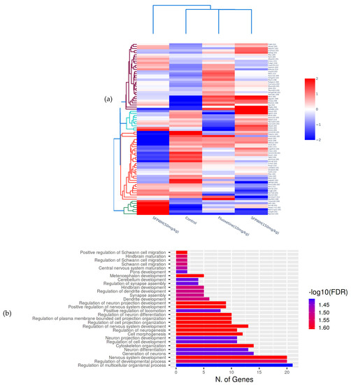 Using next-generation sequencing, RNA-seq is a powerful tool capable of detecting the quantitative measurement of RNA abundance or gene expression [24]. RNA-seq analysis of the hippocampus tissue was used to compare the differential gene expression pattern of the vehicle group compared to SFPWH-treated and fluoxetine-treated groups. As shown in Figure 4a, 72 detected subclusters and 82 transcripts. Gene ontology enrichment analysis (Figure 4b) was performed by ShinyGO v0.741 [25], revealing the top pathways for the detected genes. Data analysis showed a significant differential gene expression pattern in 22 genes, which might be potentially related to mood disorders (Figure 4c).