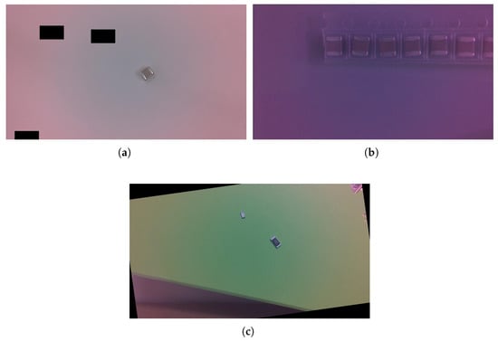 After confirming the proper conditions of our system, an initial dataset was expanded using data augmentation. The data were preprocessed to automatically reorient pixels (removing EXIF orientation). An example of image augmentation is shown in Figure 5. The data augmentation techniques that we used for the dataset were random cutouts, color augmentation, rotation. These techniques were chosen because of their inability to hide small features of electronic components. Random cutouts (shown in Figure 5a) are similar to the size of SMD components and are intended to increase the robustness of trained models. Soldering leads are the primary visual cue to distinguish SMD components. Therefore, other augmentation methods, such as brightness or contrast adjustment, which assimilate the leads and background, were not used for augmentation. Color augmentation (shown in Figure 5b) adjusts input image hue property, which randomly alters the color channels, causing a model to use alternative color schemes.