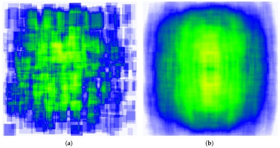 Annotation map of the location of the SMD component in the data set. Green and yellow represent higher density. (a) Annotation map of the initial dataset. (b) Annotation map of augmented dataset.