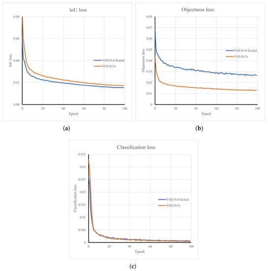 Furthermore, to train and adopt the YOLOv4-Scaled and YOLOv5s models, the PyTorch library was used. The models were trained for 100 epochs and the model sizes were 401.3 and 14.1 MB, respectively. A detailed training diagram is given in Figure 7. In the given figure, Intersection over Union (IoU), objectness and classification losses are shown. The loss of IoU shows how well the algorithms investigated can detect the center and edges of the components. Based on the results shown, YOLOv4-Scaled achieved a lower IoU loss after training for 100 epochs. Objectness loss shows the probability to find the object in the detect square box. It is shown that YOLOv5s achieved better objectness by approx. 0.014 points. Classification loss shows how well the algorithm can assign a correct label to the detected objects. Based on the results shown, both algorithms displayed similar results.