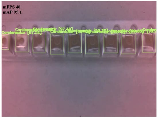 In the experimental research, several evaluation metrics were used and implemented, as described in [,]. An average precision (AP) score was calculated for each SMD component, and mean AP (mAP) score was used to assess the performance of the system to detect the four components []. IoU threshold was set to 0.75. Additionally, to evaluate the speed with which implemented architectures can detect objects, the architectures were compared by the speed of frames processed per second (FPS) and Inference Time (IT) []. Experimental results were obtained using Google Colab with Tesla P100-16 GB and Nvidia Jetson Nano 4 GB hardware setup. A sample image of successfully detected capacitors, moving in a line as packed components, on a conveyor belt, is shown in Figure 8. Components in the image were detected using the YOLOv4 architecture.