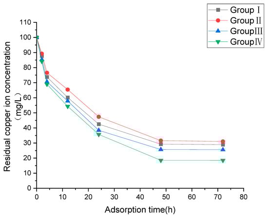 The concentration of the residual copper ion in the supernatant of each sample as a function of adsorption time is shown in Figure 4. The residual copper ion concentration showed a similar trend for different dosage amounts. At the beginning of the adsorption reaction (0–12 h), the residual copper ion concentration decreased significantly with the increasing time; at the middle of the adsorption reaction (12–48 h), the residual copper ion concentration decreased slowly with time; at the end of the adsorption reaction (48–72 h), the adsorption equilibrium state was reached. The reason for this trend could be that the initial adsorption occurs mainly on the surface and in the pores of RSAC particles. In the initial adsorption stage, there are many active sites on the surface and in the pores of RSAC particles so copper ions could occupy the active sites rapidly and show the characteristics of a fast adsorption rate [22]. With the extension of time and the increase of adsorption capacity, the active sites become fewer [23]. It was also found that there were large functional groups on the surface of FA and MFA, such as O-H, C=C, and Si-O-Si, which played a crucial role in the process of adsorption of heavy metal ions [24]. It could be inferred that the adsorption equilibrium time of copper ions on RSAC particles is 48 h. This is consistent with the experimental results to explore the optimal ratio of RSAC particles. Therefore, the adsorption time could be set as 48 h in the subsequent static adsorption experiments.