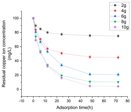 RSAC particles were weighted and divided into five groups: 2, 4, 6, 8, and 10 g. The groups were put into conical flasks, respectively, with 150 mL of 100 mg/L copper ion solution. Then, all the samples were mixed at room temperature (25 ± 1 °C). The concentration of residual copper ion in the supernatant of each sample was measured at a specific time and the relationship was investigated.