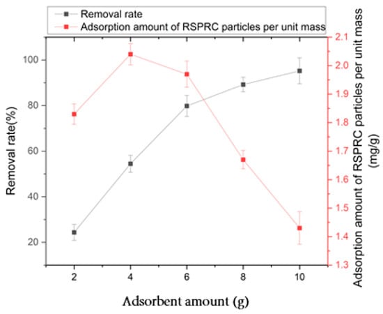 Figure 5 shows the correlation between adsorbent amount and copper ion adsorption. Firstly, the copper ion removal rate increased continuously with the increase of the RSAC particle amount, but the slope decreased at the same time. Meanwhile, the adsorption amount per unit mass of RSAC particles showed a different trend: the adsorption amount per unit mass of RSAC particles increased at the beginning stage and decreased after reaching a specific point with the increase of the adsorbent amount. The two trends indicated that there was a balance point between efficiency and performance. The amount aimed best removal rate may lead to inefficient usage of RSAC particles: the adsorption capacity per mass of RSAC particles was only 1.43 mg/g at 10 g, which indicated that the adsorption performance of RSAC particles was not fully utilized. The reason may be that the copper ion removal rate increased because of the increase of RSPRC particle amount, the increase in contact area, and the increase in the number of adsorption sites [25].