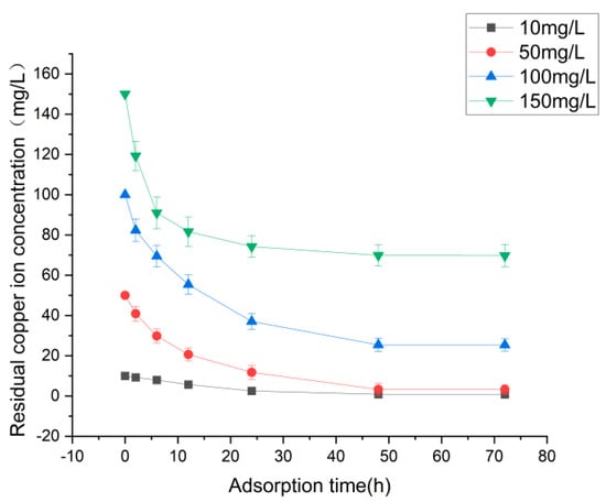 The relationship between the initial concentration and the residual concentration of copper ions is shown in Figure 6. The removal rate of copper ions and the adsorption amount per unit mass of RSAC particles in each sample after adsorption for 72 h is presented in Table 9. As shown in Figure 6, a high initial copper ion concentration led to a corresponding steep adsorption curve and a fast adsorption rate compared with a low initial concentration sample in the pre-sorption stage. This could be attributed to high initial copper ion concentration providing a sufficient driving force for mass transport, which could make ions occupy the active site on adsorbents rapidly, facilitating the adsorption of copper ions by RSAC particles [27,28].