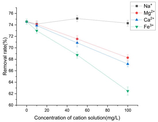 Figure 7 shows the relationship between the metal cation concentration and the effect on the removal of copper ions. The results revealed that the adsorption removal rate of copper ions by RSAC particles fluctuates in a small range with the increase of Na+ concentration, which indicated that Na+ has a weak competitive behavior against RSAC particles. The adsorption removal rate of copper ions by RSAC particles decreases with the increase of Mg2+ and Ca2+ concentration, which indicated that Mg2+ and Ca2+ may have some effect on the removal rate. The adsorption removal rate decreased significantly with the increase of Fe3+ concentration, from 74.65% to 62.47%, which indicated that Fe3+ had a significant inhibitory effect on the adsorption of copper ions.