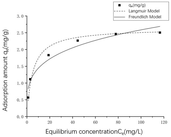 In Equation (4), qe is the adsorption equilibrium adsorption capacity (mg/g), Ce is the equilibrium concentration (mg/L), qmax is the maximum adsorption capacity (mg/g), and KL is the Langmuir adsorption constant.