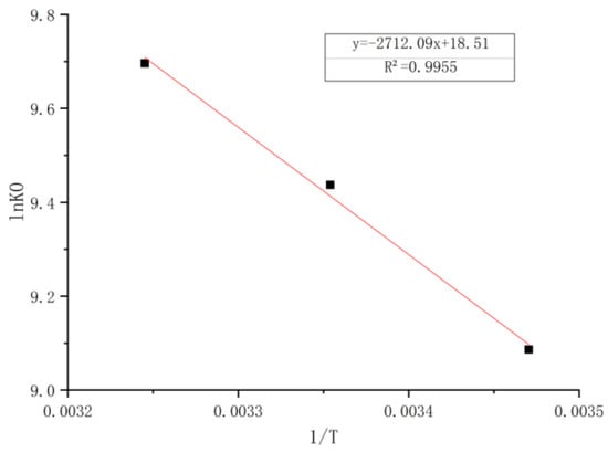 In Equations (8) and (9), T is the thermodynamic temperature (K), is the enthalpy change of adsorption (kJ/mol), is the free energy of adsorption (kJ/mol), is the change in entropy of adsorption [J/(mol·K)], R is the molar volume constant 8.314 J/(mol·K), and K0 is the adsorption partition coefficient, usually taken as the Langmuir constant KL. Using the isothermal adsorption experimental data of RSAC particles at different temperatures, the adsorption equilibrium coefficient K0 was calculated [21]. A straight line could be fitted by using the inverse of the temperature 1/T as the horizontal coordinate and lnK0 as the vertical coordinate for the graph.