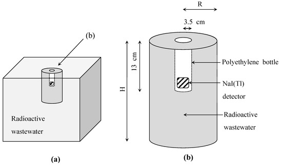 In this simulation, the geometry of the scintillation detector was designed based on the drawing provided by the manufacturer, and the density of the NaI(Tl) detector was 3.667 g·cm−3 [23]. In this case, the volume of radioactive wastewater used in the calculation ranged from 14 to 56.1 L.