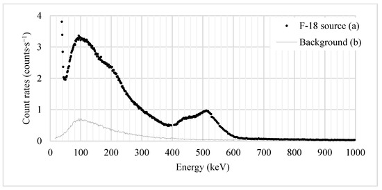 The count rates measured for the sample including 18F and the background count rates are shown in Figure 2a,b, respectively. Figure 2a confirms that the 511 keV gamma rays are emitted by 18F. Because the background count rate was only approximately 5.2% around the 511 keV peak, that of the sample including 18F, the graph subtracting the background count rate from Figure 2a was almost the same as in Figure 2a; therefore, it was not separately indicated in the graph.