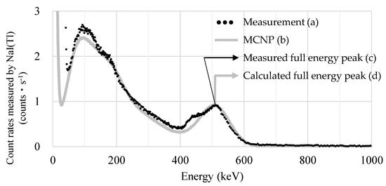 Finally, the cause of the peak around 440 keV in Figure 4 could be the difference between the MCNP geometry in the calculation and the real geometry of the material used in the experiment. This is because there was no peak at approximately 440 keV when the same sample was measured using a gamma spectroscopy system with HPGe.