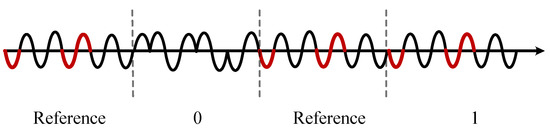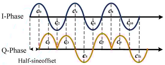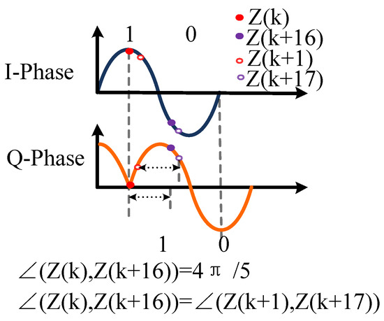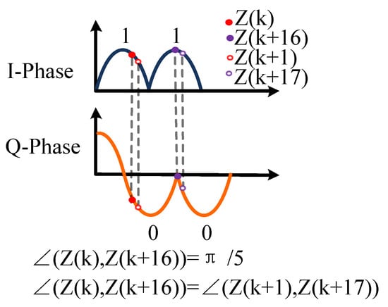 When two consecutive chips on I-phase are the same and two consecutive chips on Q-phase are the same, there would be a stable period. For instance, as shown in Figure 6, chips on I-phase are two ‘1’s and chips on Q-phase are two ‘0’s, is equal to . When two consecutive chips on I-phase are different and two consecutive chips on Q-phase are different, there also exists a stable period. For instance, as shown in Figure 7, chips on I-phase are ‘1’ and ‘0’ and chips on Q-phase are ‘1’ and ‘0’, is equal to . Hence, after adding , equals to and . In other cases, there would not be a stable period. □