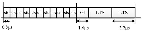 The WiFi signal is detected by WiFi preamble detection, which is designed to detect the WiFi signal and trigger the subsequent WiFi decoding process. In Figure 3, a WiFi preamble consists of ten repeated short training symbols (STS) and two repeated long training symbols (LTS). The duration of STS and LTS are 0.8 μs and 3.2 μs, respectively. Essentially, if ten repeated signals are detected, this signal is determined to be the WiFi preamble.