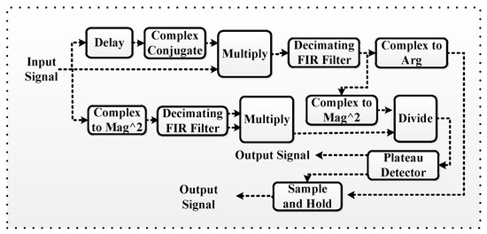 The most common applied WiFi preamble detection algorithm is the Schmidl–Cox algorithm, which has two main functions: WiFi preamble detection and carrier frequency offset estimation, as shown in Figure 4. Sampling rate of a WiFi device is 20 M/s and duration between two consecutive samples is 0.05 μs. denotes amplitude of the sample. As illustrated in Figure 3, duration of a short training symbol is 0.8 μs, which also equals to the duration of 16 samples [16]. Hence, if and are sampled on WiFi preamble.
