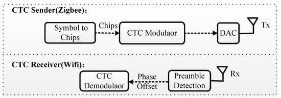 According to our analysis in Section 2.2, if the consecutive chips on I-phase and Q-Phase form a continuous sine wave, the phase offset value at WiFi preamble detection is stable at . Then, if we could modify some of the ZigBee chips, we would be able to extend the duration of the stable phase pattern at WiFi preamble detection. Hence, we control ZigBee sender to generate a longer sinusoidal waveform, which induces longer stable phase offset values at WiFi preamble detection. The modified ZigBee chips would be tolerated at the ZigBee receiver; hence, the communication between ZigBee devices would not be affected severely. Meanwhile, the sinusoidal waveform (generated by modified chips) can be detected in WiFi preamble detection and the carried CTC data would be demodulated by the WiFi device.