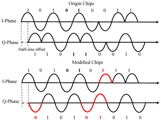 In half-sine O-QPSK modulator, chips with even index are placed on I-phase while chips with odd index are placed on Q-phase. ZigBee devices use Direct digital synthesizer (DDS) to generate the waveform in half-sine pulse shaping. Specifically, DDS would generate 4 samples: 0, , , , which are the envelop of a half-sine waveform. Chip “0” would be shaped into a low half-sine wave through multiplication of −1 and these 4 samples. Chip “1” would be shaped into an up half-sine waveform by multiplying 1 and these 4 samples. Therefore, manipulating the generated waveform equals to control the chips. To extend sinusoidal waveform, as illustrated in Figure 9, we flip four red marked chips by switching the chip value. Finally, our modification leads to a 6.5 μs sinusoidal Wave at the ZigBee sender.