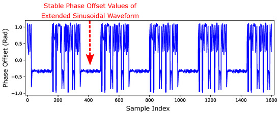 In this experiment, we set the number of modified chips to 6 and the results are recorded in Figure 12. In this figure, phase offset of the extended sinusoidal waveform is around with standard variance of 0.07. These fluctuations are caused by noise and multipath fading.
