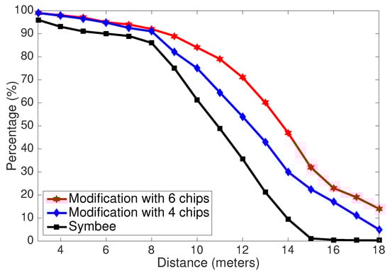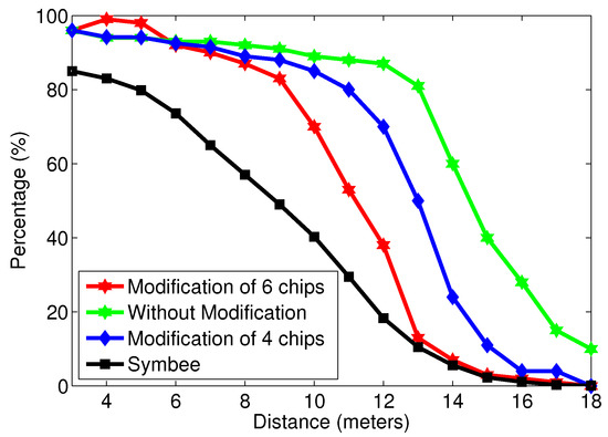 We compare the CTC-SAR. We set the number of modified chips in our design as 4 and 6. In this experiment, we collect CTC bits at WiFi receiver for 10 min and then move CTC ZigBee sender 1 more meter away from the WiFi receiver. The comparison result is shown in Figure 13. This figure shows that the CTC bits accepted ratio of our design is higher than that of Symbee, especially when the distance is more than 8 m. From the figure, we can also find out that as more chips are modified, our CTC design becomes more robust. Moreover, if the distance between sender and receiver is too far, ZigBee signal would be distorted at the CTC receiver side dramatically. Hence, the bits accepted ratio of CTC drops if the CTC receiver is too far.