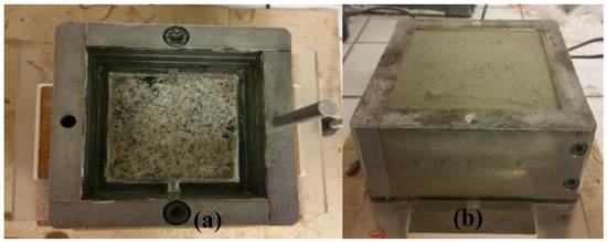 Sample preparation: (a) lower half shear box with granite; (b) upper half shear box with concrete.