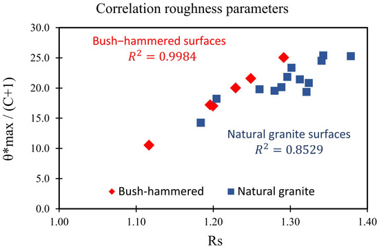 The results of this characterization are presented in Figure 3. It can be assessed that for the bush-hammered interfaces the two parameters have a higher correlation, which is understandable since from a smooth surface to a bush-hammered surface only a very small change is applied to the area and this change is well captured by the two roughness parameters because they take into account the notion of area. This is not true for the naturally rough granite surfaces, because the roughness of these surfaces is more complex and sensitive to other parameters such as the shear direction, which is not taken into account in the Rs parameter.