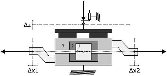 The direct shear tests of the concrete–granite interface were performed using the BCR3D [48,49]. The BCR3D (Figure 4) is a shear machine of the 3SR laboratory, Univ. Grenoble Alpes, France, in which the shear loading is applied as displacement in both the upper and lower half shear box in opposite directions so that the normal load remains perfectly centered with the surface during shear displacement. The direct shear test performed for this research project can be classified as a test under a constant normal loading (CNL). The normal load was applied with a rate of 10 kPa/s and the shear loading was applied with a rate of 0.1 mm/min and 0.6 mm/min. The shear loading consisted of applying a displacement of at least 5 mm in the two halve shear boxes in opposite directions. These loading rates are within the range of loading rates suggested by the ISRM [12]. At this point, it is noteworthy to mention that the normal load is modified to account for the residual surface in contact so that the mean normal load is kept constant throughout the test.