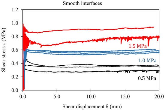In addition, it is worth mentioning that the oscillations in Figure 5 and other experimental results are related to the configuration of the shear machine and the phenomenon of stick and slip [50]. In the BCR3D, the test was conducted by applying displacement in the two halves shear boxes at a certain rate. This rate was maintained during the test using a loop that computes the necessary force to produce the same increment of displacement in time. The problem is that the variable force in this loop depends on the resistance of the interface and this later is not constant. There are instants of shear displacement with low resistance and instants of shear displacement with high resistance. The change between these two types of instants depends on the interface being tested and can occur in a very short interval of time, such that the correction of force to produce the same increment of shear displacement needs updating constantly, and this does not give enough time to the all system to adjust, generating oscillations in force. These oscillations have an insignificant influence on the shear evolution and are left “as it is”, without filtering, intentionally. Similar oscillations can also be observed in the results of direct shear tests presented in Stavropoulou et al. [49].