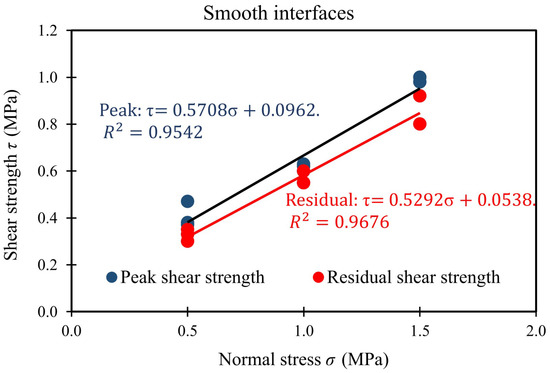 Peak and residual shear strengths in terms of normal stress (smooth surface).