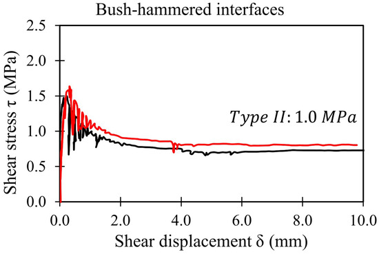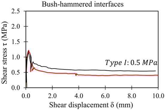 Figure 8 and Figure 9 show that the peak shear strength obtained in the tests with bush-hammered surfaces is much higher than the residual shear strength, which is a clear indicator of the formation of strong bonds between concrete and granite.
