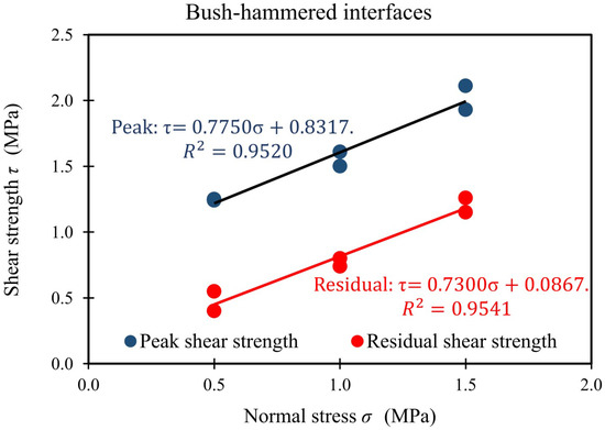 Peak and residual shear strength in terms of normal stress (bush-hammered interfaces).