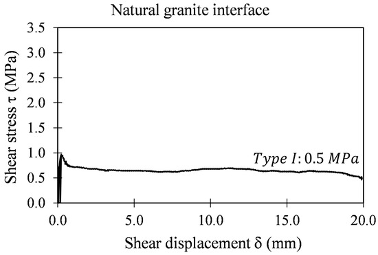 First, the results of the numerical simulations of all the naturally rough concrete–granite interfaces carried out, reproduce: the first phase of the model (Figure 15, between A and B), by showing the linear increase in the shear stress with shear displacement; the second phase of the model (Figure 15, between B and C), by presenting the decrease in the shear stress with shear displacement, and, the third phase of the model (Figure 15, between C and D), by displaying the evolution of the shear displacement with insignificant change in the shear stress. This is good evidence that the simplifications made during the conception of the model are satisfactory and properly reproduced.