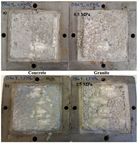 Failures behavior—natural granite interface. (a) Confinement stress 0.5 MPa: left-Concrete and right Granite; (b) Confinement stress 1.5 MPa: left-Concrete and right Granite.