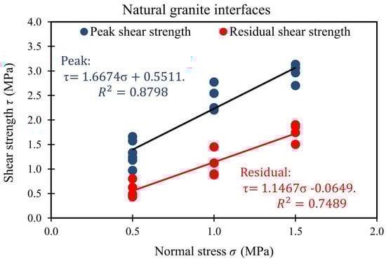 Peak and residual shear strengths in terms of normal stress (natural granite interfaces).