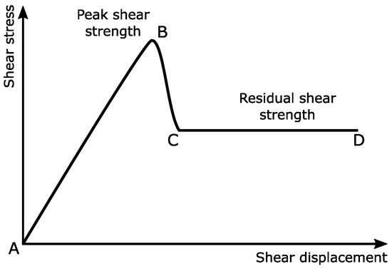 As expected, the shear strength varies with the normal stress, the relationship between the peak shear strength and the normal stress has a linear correlation coefficient of 95.4% (Figure 6), and the interface has a cohesion of 96.2 kPa and a friction angle of 29.7°. For the residual stress, the correlation coefficient is 96.8%, and the cohesion and the friction angle are, respectively, 53.8 MPa and 27.9°.