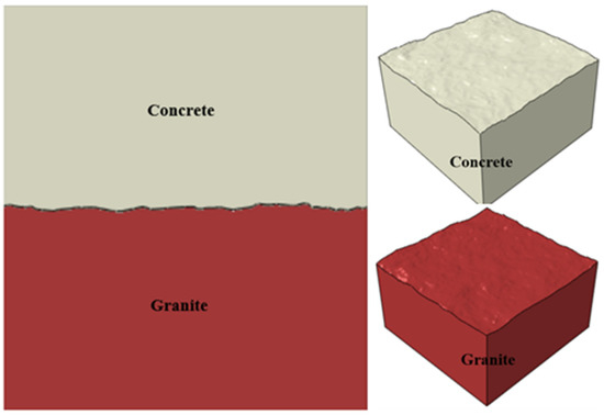 The bush-hammered and natural granite surfaces were cleaned and scanned using a laser profilometer with a vertical resolution of 0.05 mm. After this process, the granite block was put into the lower half shear box, then adjusted to make the mean shear plane parallel to the shear load, and after this adjustment, concrete was cast to complete the lower half shear box. To complete the sample, concrete was poured into the upper half shear box positioned on top of the lower half shear box containing the granite block (Figure 2). The concrete–granite assembly was left to cure for 28 days at ambient temperature. The granite blocks have a volume of about 10 × 10 × 5 cm3.