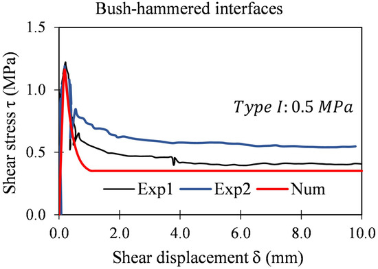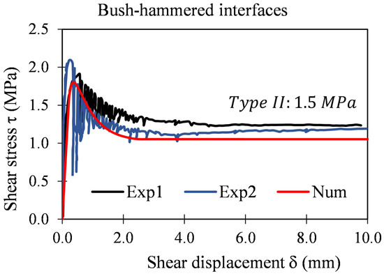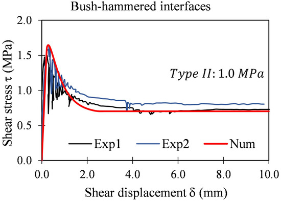 Third, the model can reproduce the influence of the normal stress on the shear stress evolution; this can be observed in the comparison of the results of the simulations with 1 and 1.5 MPa of confinement stress for the bush-hammered interface, noting that the only parameter separating these simulations is the normal stress (see, for example, Figure 22 and Figure 23).