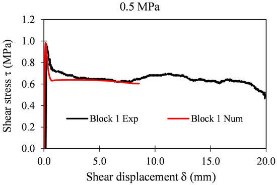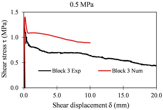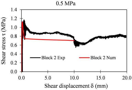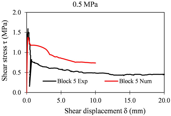 Shear stress evolution with displacement Exp–Num (Block 5).