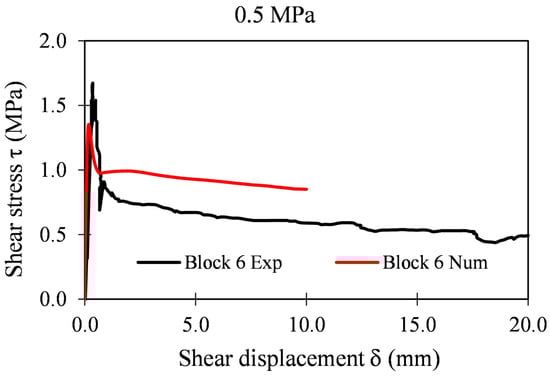 Shear stress evolution with displacement Exp–Num (Block 6).