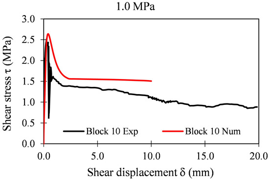 Shear stress evolution with displacement Exp–Num (Block 10).