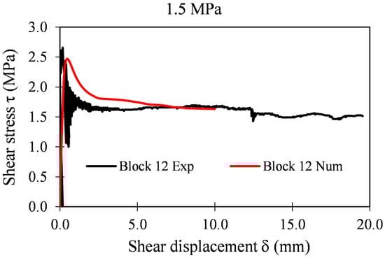 Shear stress evolution with displacement Exp–Num (Block 12).