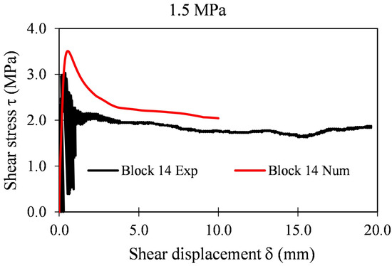 Shear stress evolution with displacement Exp–Num (Block 14).
