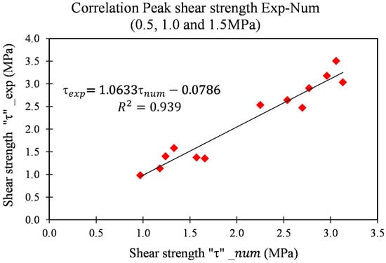 Overall, the cohesive frictional model can capture well the main mechanisms and trends of the shear stress evolution of rough and bonded concrete–rock interfaces and present good prediction capability in terms of the peak shear strength with the coefficient of correlation between the peak shear strength obtained experimentally and the peak shear strength obtained numerically above 93% (see Figure 37).