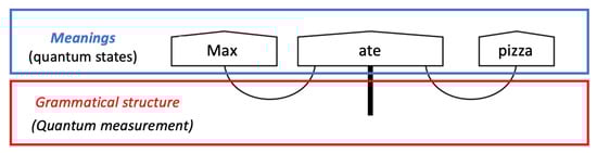This vector in the tensor product space can be considered as the meaning of the sentence “Max ate pizza”. Subsequently, this model has been reformulated in quantum terms, creating the pregroup only using Bell-effect and identities [24]. In this diagrammatic notation (see Figure 2), pentagons represent quantum states and wires represent the Bell-effect. The equivalence of wire structure with pregroup grammar has been demonstrated [31].