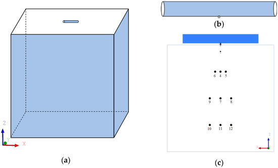 Three-dimensional geometric model of gas leakage and diffusion: (a) leakage space; (b) pipeline and leakage section; (c) monitoring surface and distribution of measuring points.